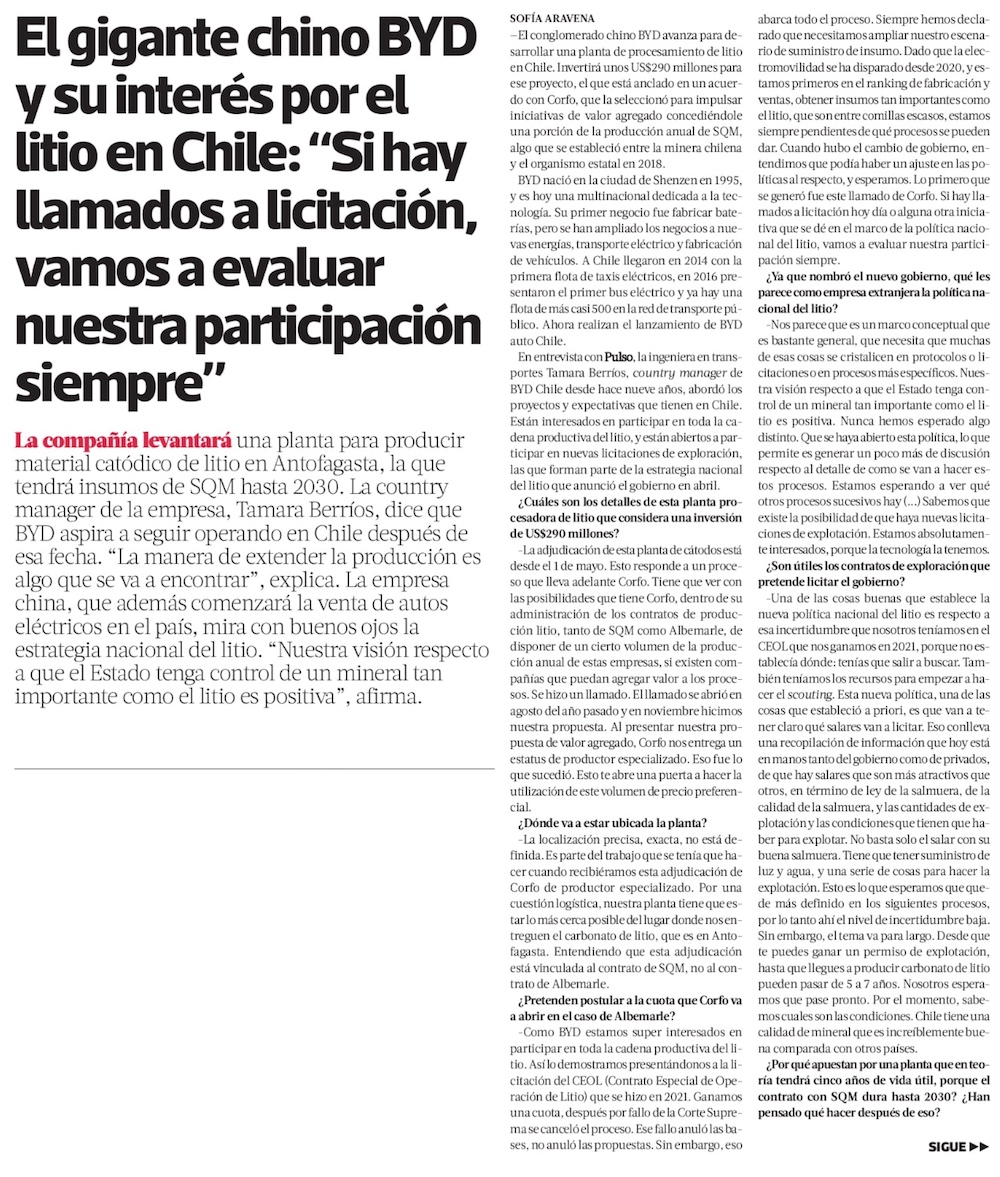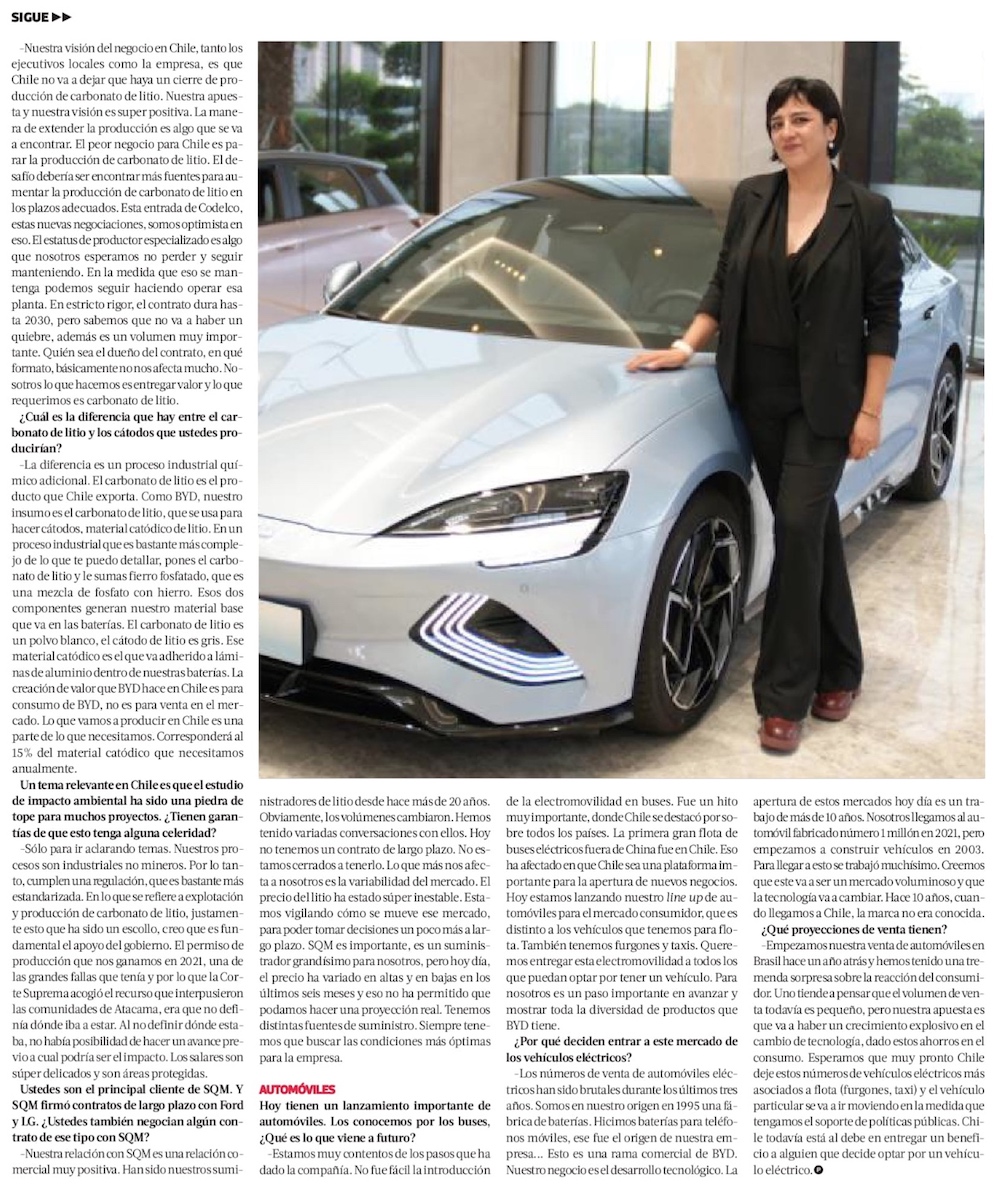 China BYD hace su lanzamiento oficial en Chile y pide al Gobierno "ser agresivo" en el desarrollo del litio - (Diario Financiero)