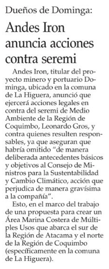 Andes Iron presentará acciones legales en contra de seremi de Medio Ambiente - (El Día)