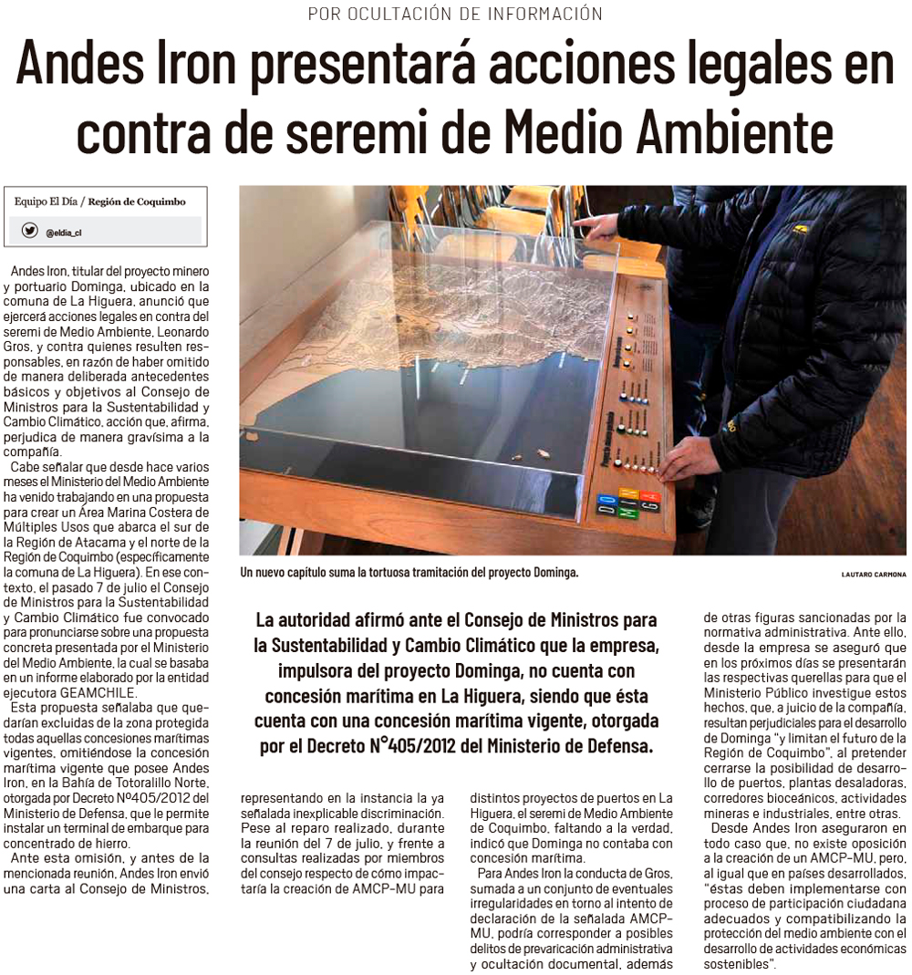 Dominga: Andes Iron anuncia acciones legales contra seremi de Coquimbo por omitir que proyecto tiene concesiones marinas - (Diario Financiero)