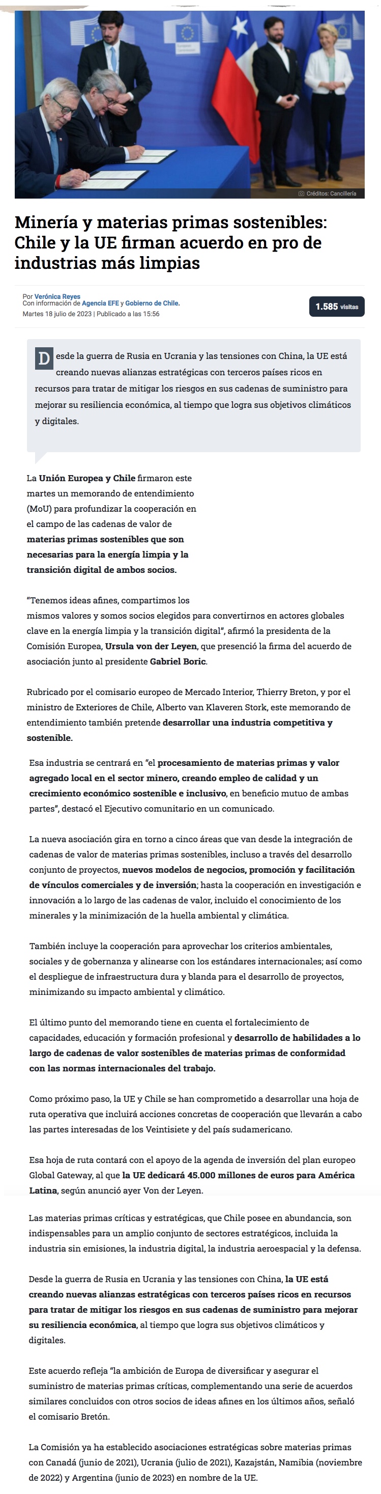 UE y Chile firman asociación sobre materias primas con el litio en la mira - (El Mercurio de Santiago)