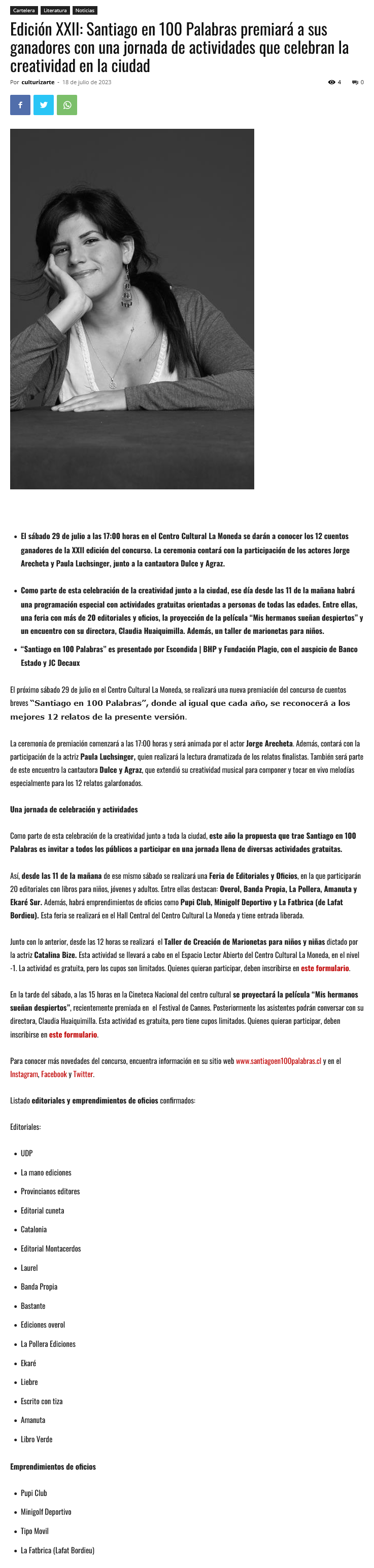 Premiación Santiago en 100 Palabras tendrá una feria de editoriales y oficios, talleres y actividades gratuitas en completa jornada familiar - (Adprensa.cl)