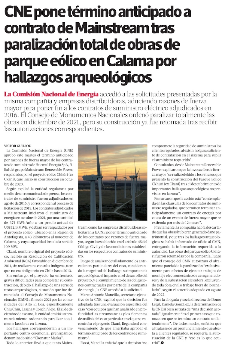 Proyecto Ckani: CNE termina los contratos de suministro por hallazgos arqueológicos - (El Mercurio de Calama)