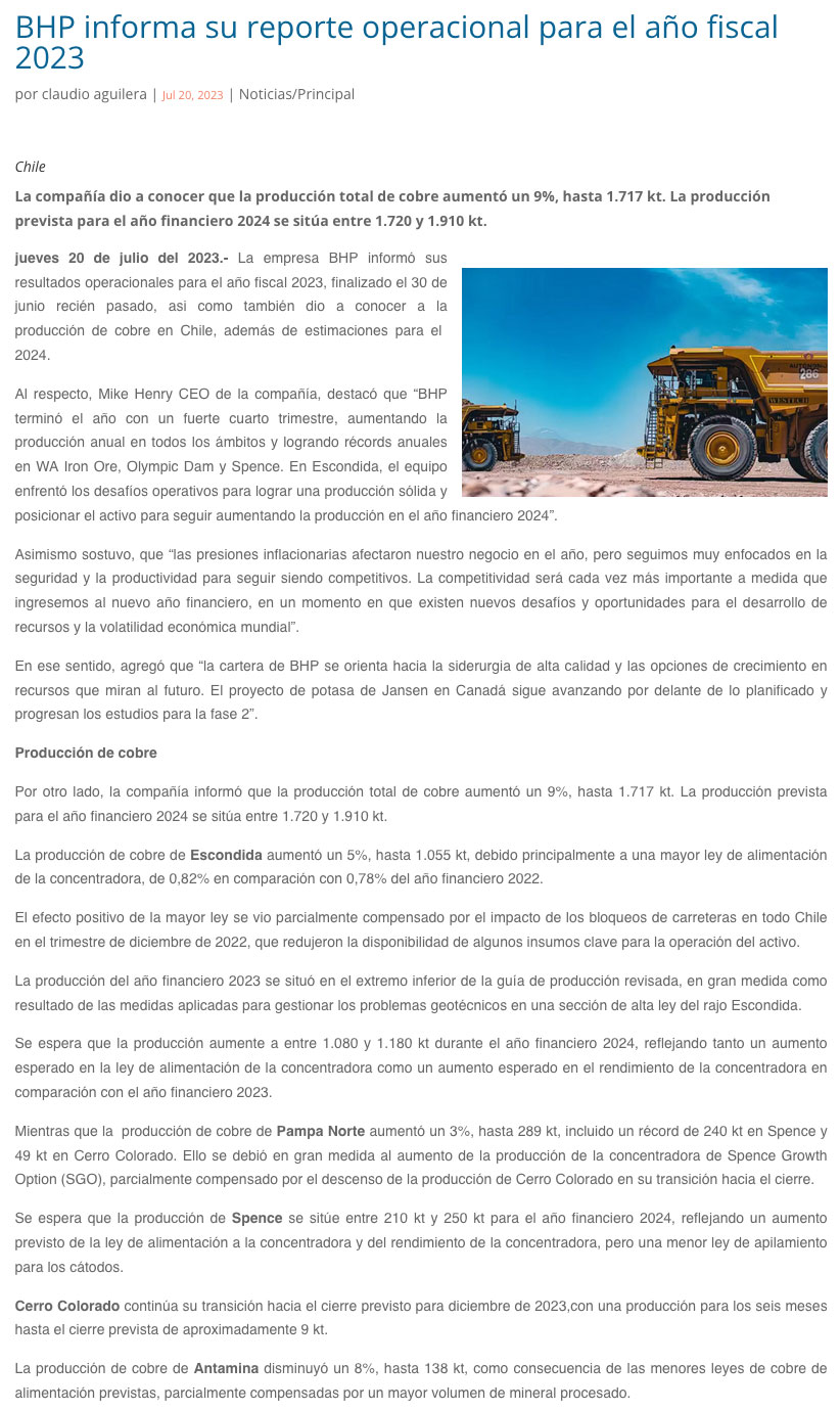 BHP da a conocer su reporte Operacional para el año fiscal 2023 - (mch.cl)
