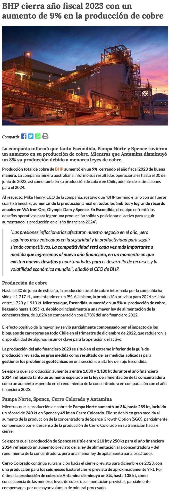 Producción de cobre BHP aumentó 9% en su año financiero julio 2022 – junio 2023 - (mineriayfuturo.cl)
