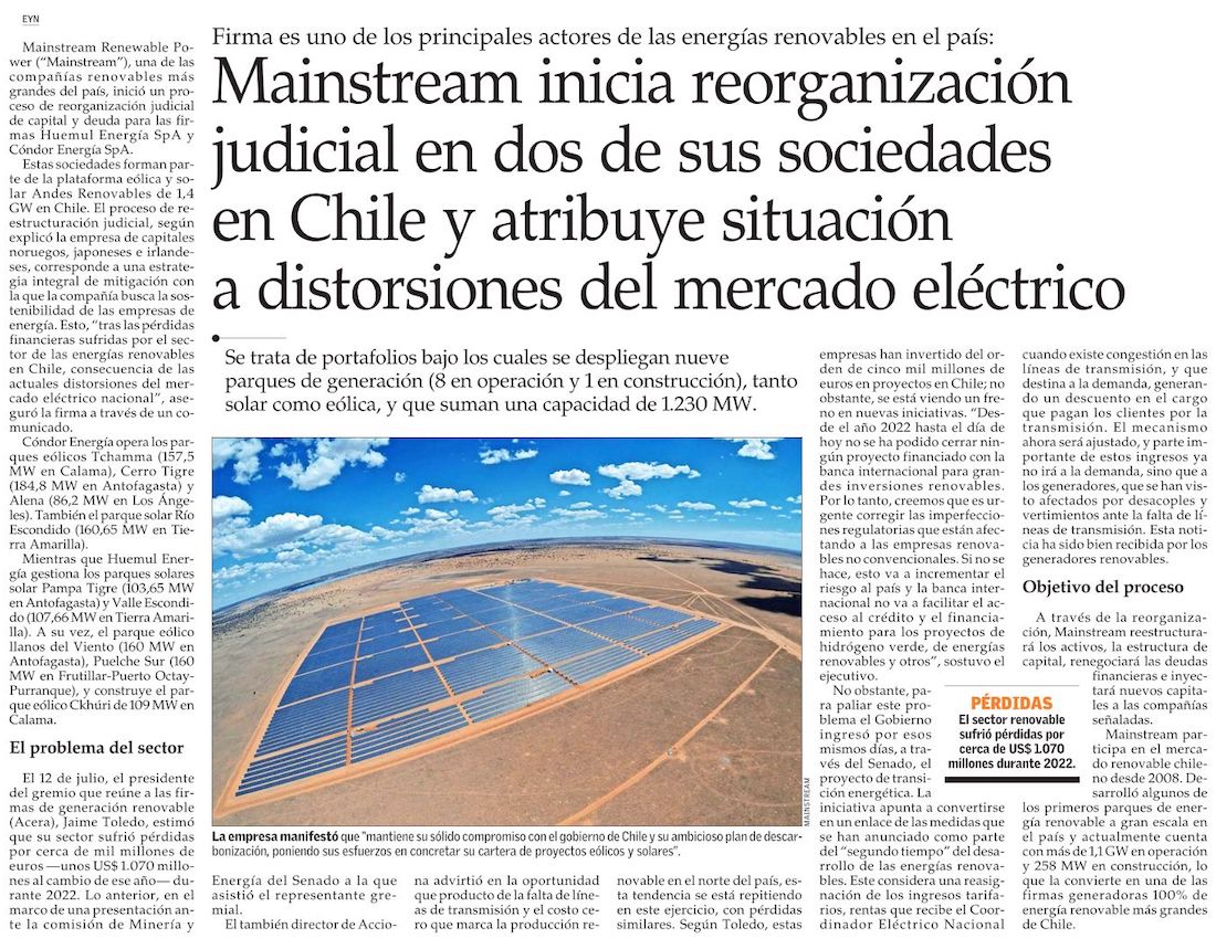 Mainstream inicia proceso de reorganización judicial para dos de sus sociedades en Chile - (Diario Financiero)