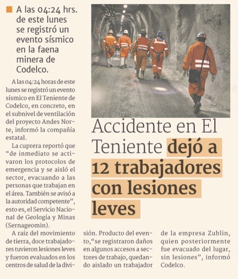 Ofician a ejecutivos de Codelco para que expliquen accidente en El Teniente ante comisión de Minería - (El Mercurio de Santiago)