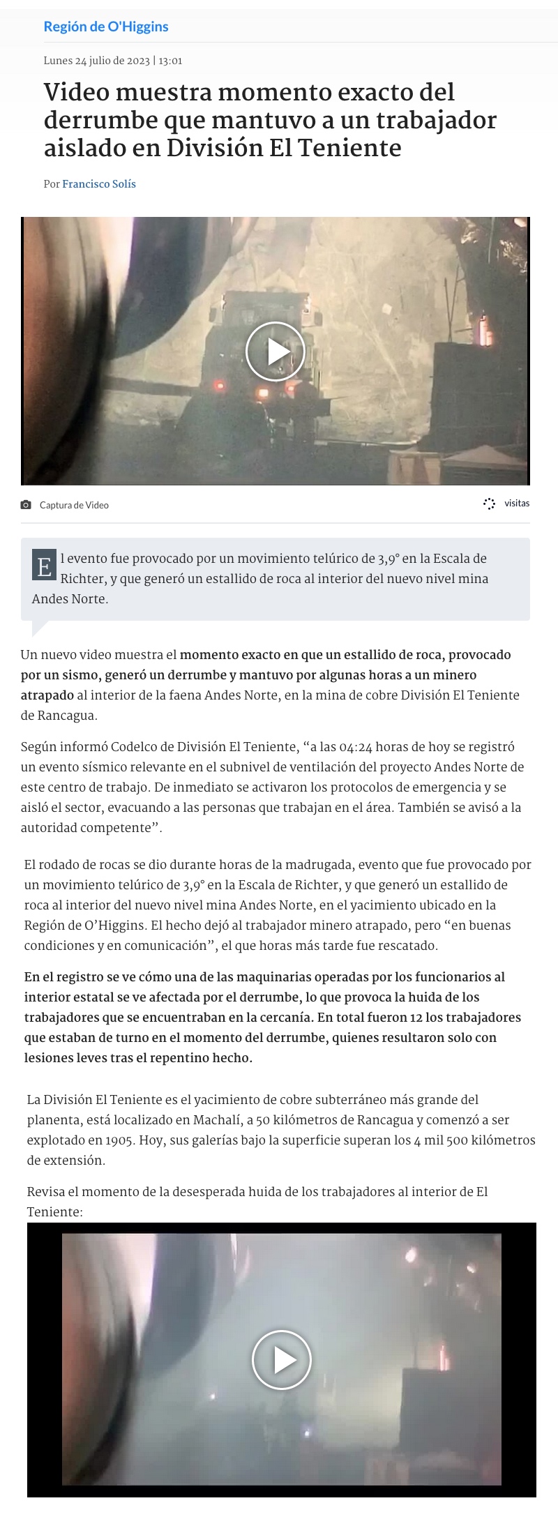 Accidente en El Teniente dejó a 12 trabajadores con lesiones leves - (Diario Financiero)