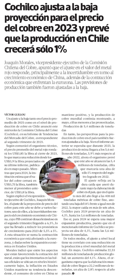 Cochilco ajusta a la baja proyecciones de precio del cobre para 2023 y 2024 por incertidumbre sobre China - (Diario Financiero)