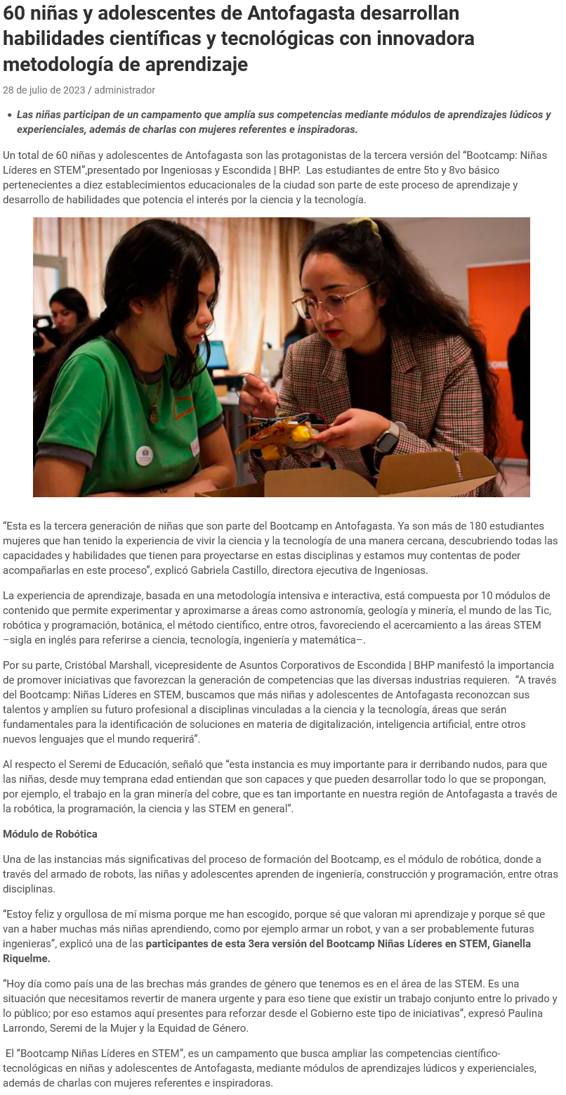 60 niñas y adolescentes de Antofagasta desarrollan habilidades científicas y tecnológicas con innovadora metodología de aprendizaje - (norteyenegia.cl)