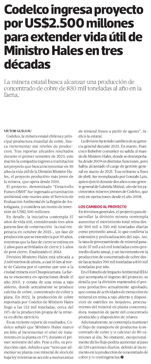 Codelco invertirá US$2.500 millones en extender vida útil de Ministro Hales por más de 30 años - (Diario Financiero)
