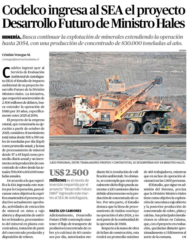 Codelco invertirá US$2.500 millones en extender vida útil de Ministro Hales por más de 30 años - (Diario Financiero)