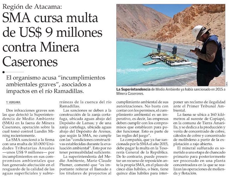 Superintendencia del Medio Ambiente multó a Caserones por US$ 9 millones por infracciones graves al uso de agua - (DF Online)