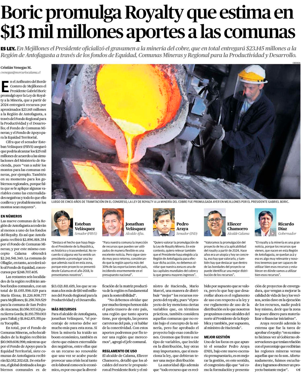Boric promulga la ley de royalty minero y pide seguir ese ejemplo para avanzar en el pacto fiscal y la reforma previsional - (Pulso)