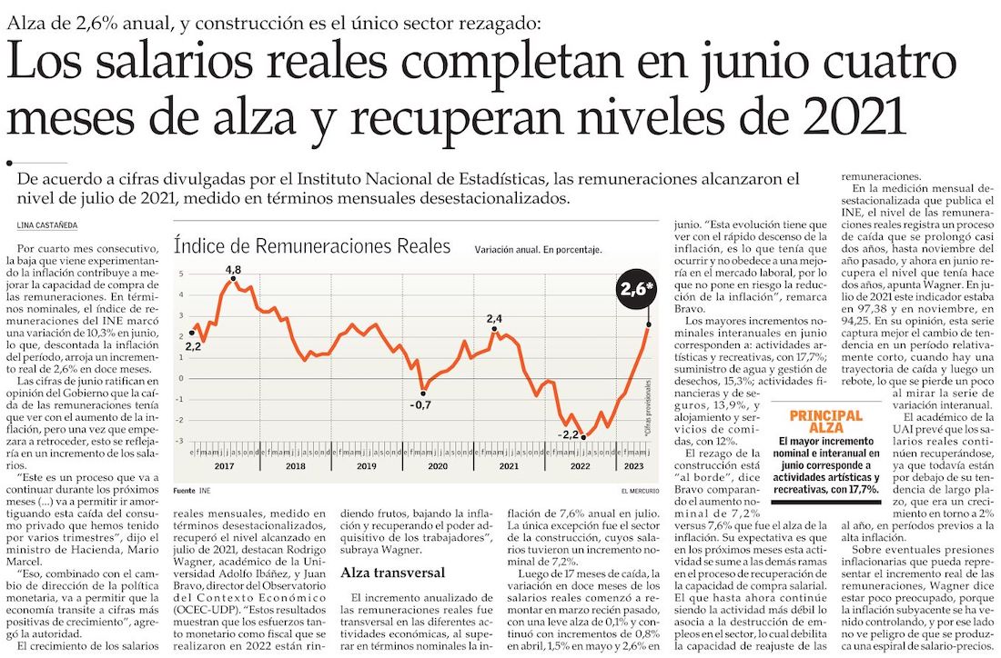 Salarios de los chilenos crecieron por cuarto mes consecutivo durante junio - (Diario Financiero)