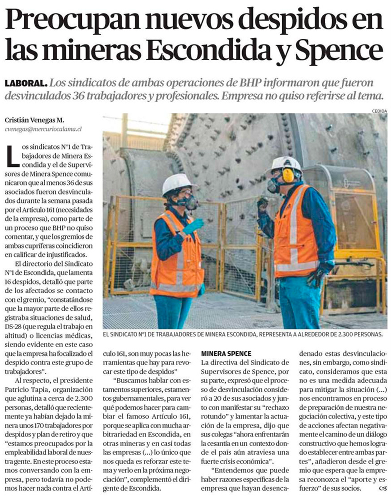 Preocupan nuevos despidos en las mineras Escondida y Spence - (Estrella del Loa)