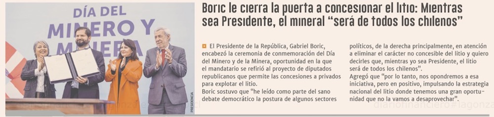 Boric descarta hacer concesible el litio y asegura que mientras sea Presidente, el mineral serĂ¡ "de todos los chilenos" - (Pulso)
