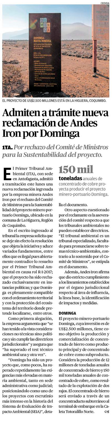 1TA admite a trámite recurso por proyecto Dominga - (El Mercurio de Antofagasta)