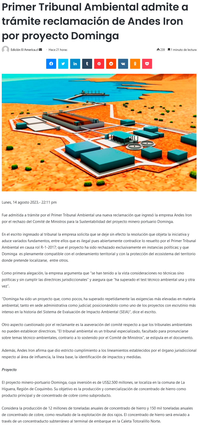 Admiten a trámite nueva reclamación de Andes Iron por Dominga - (El Mercurio de Antofagasta)