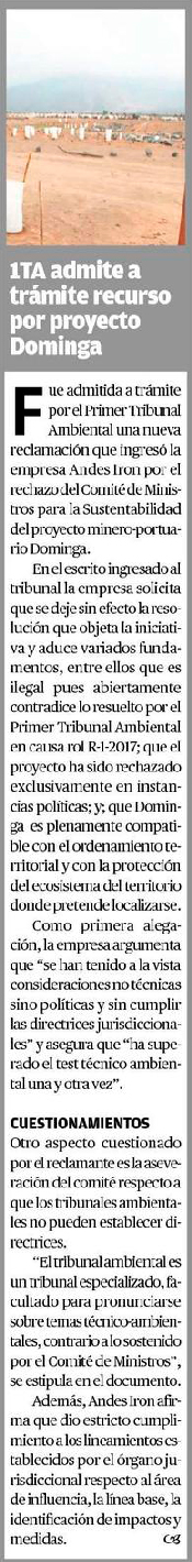 Admiten a trámite nueva reclamación de Andes Iron por Dominga - (El Mercurio de Antofagasta)