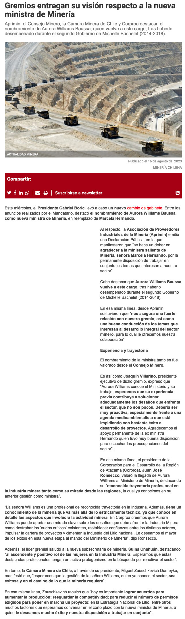 Gremios mineros coinciden en destacar trayectoria - (El Diario de Atacama)