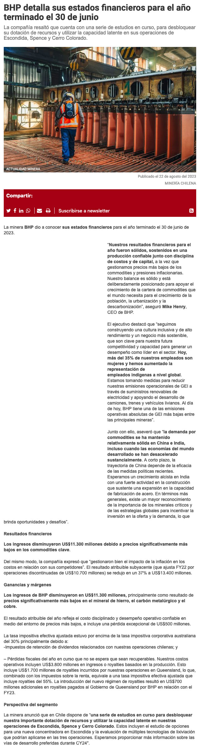 BHP entrega sus estados financieros para el año terminado el 30 de junio - (reporteminero)
