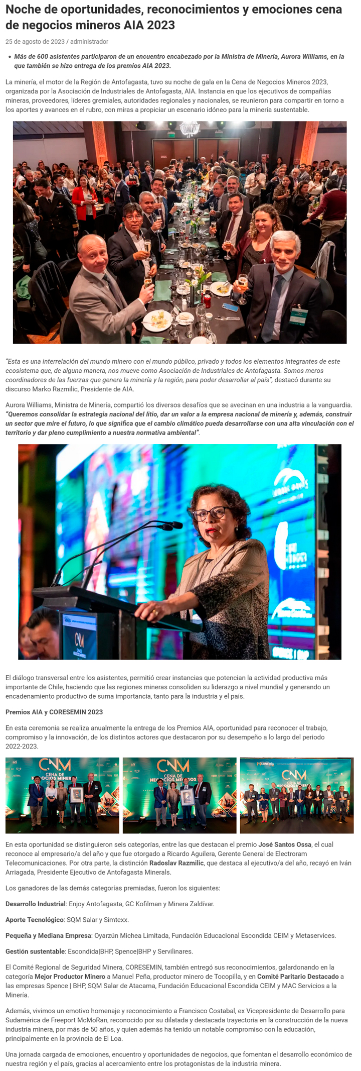 Noche de oportunidades, reconocimientos y emociones en Cena De Negocios Mineros AIA 2023 - (norteyenegia.cl)