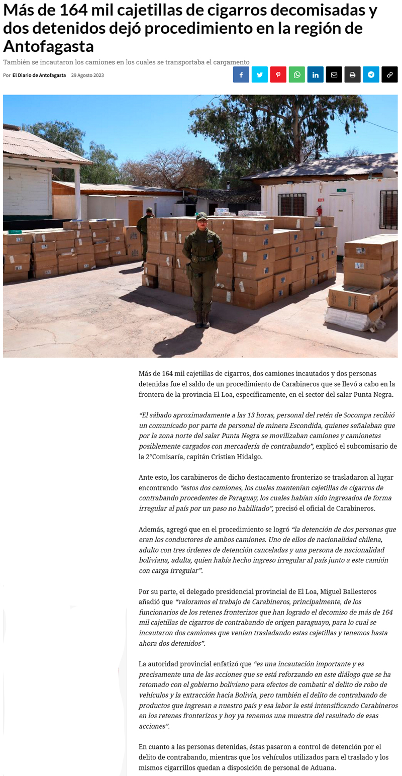 Decomisan más de 164 mil cajetillas de cigarros y dos detenidos en procedimiento de Carabineros en la frontera - (calamaenlinea.cl)