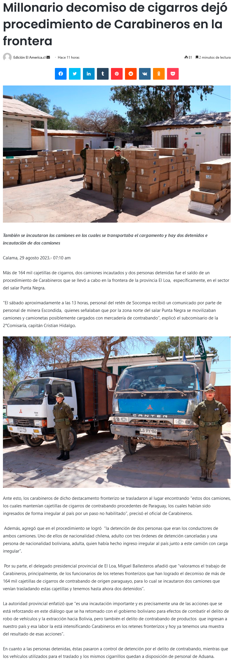 Decomisan más de 164 mil cajetillas de cigarros y dos detenidos en procedimiento de Carabineros en la frontera - (calamaenlinea.cl)