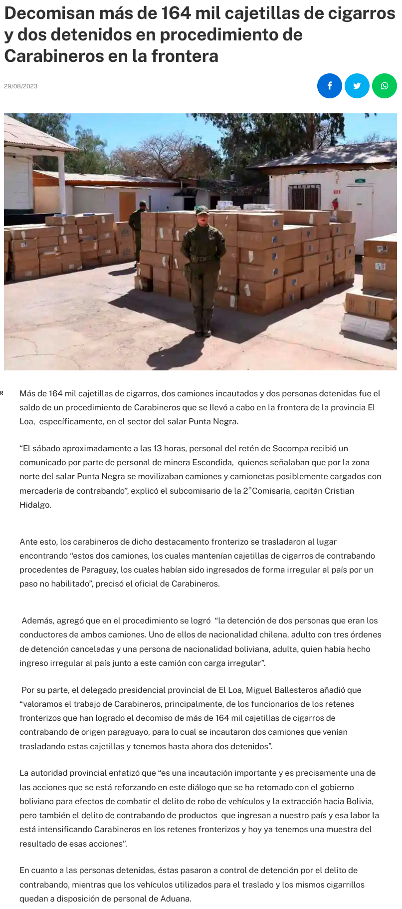 Más de 164 mil cajetillas de cigarros decomisadas y dos detenidos dejó procedimiento de Carabineros en la frontera - (termometro.cl)