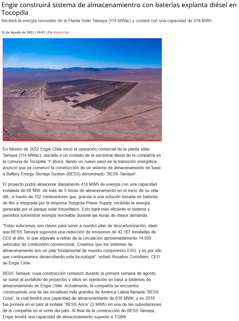 Engie inicia construcción de un sistema de almacenamiento en terrenos de ex central diésel en Tocopilla - (DF Online)