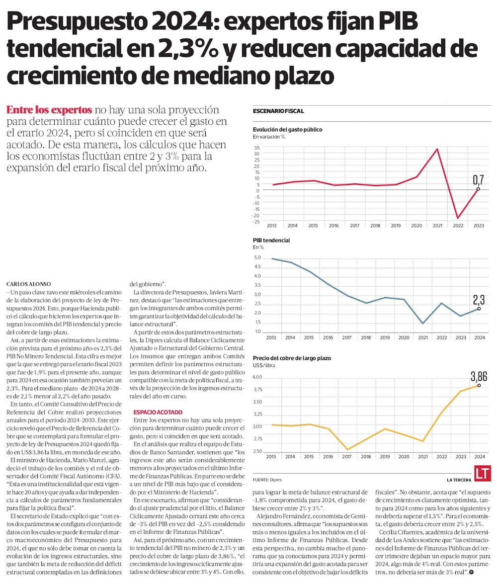 Presupuesto 2024: economistas ven un acotado espacio para alza del gasto tras nuevos parĂ¡metros del PIB y Cobre - (Diario Financiero)