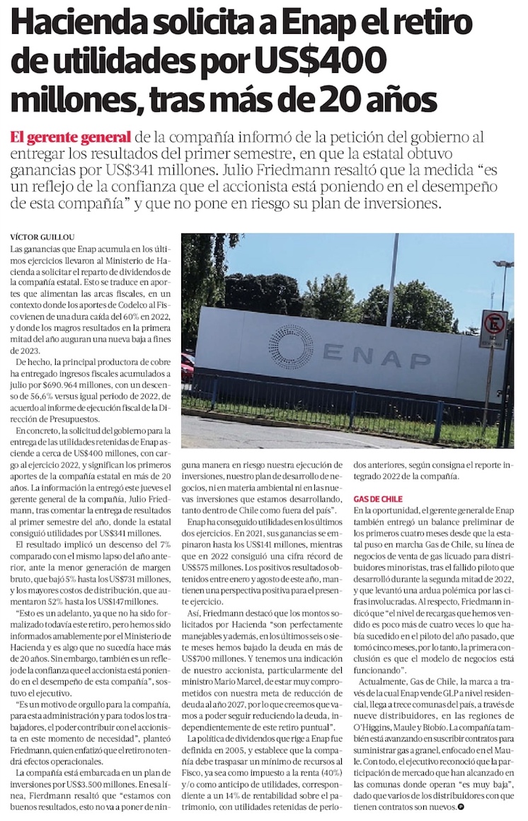 Ministerio de Hacienda informa a la Enap el retiro de utilidades por US$ 400 mills. - (El Mercurio de Santiago)