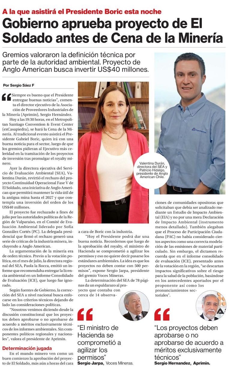 SEA aprueba fase V de El Soldado de Anglo America y operará hasta 2027 - (Diario Financiero)