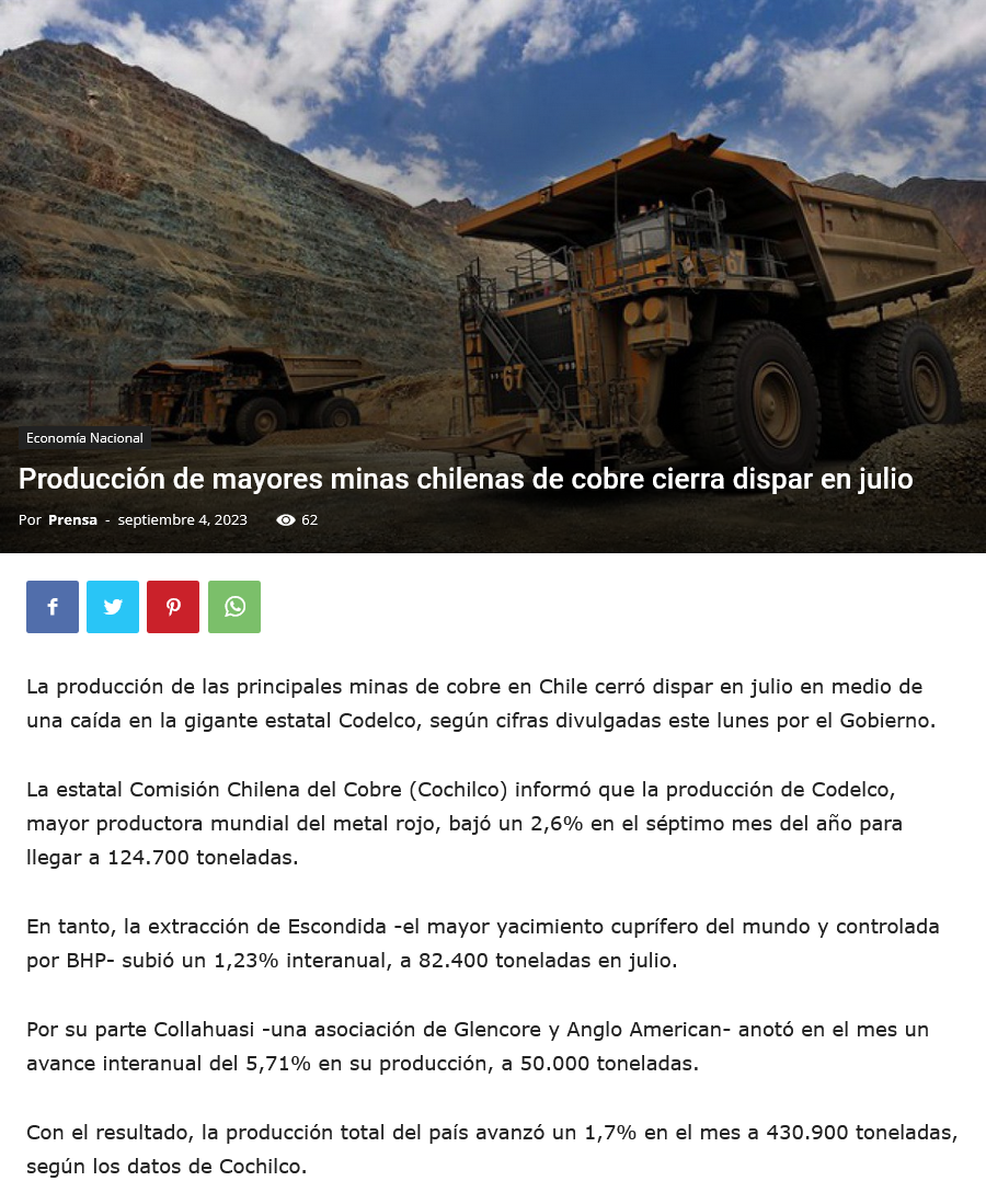 Producción de cobre repunta en julio, pero acumula caída de 3,2% - (El Mercurio de Santiago)