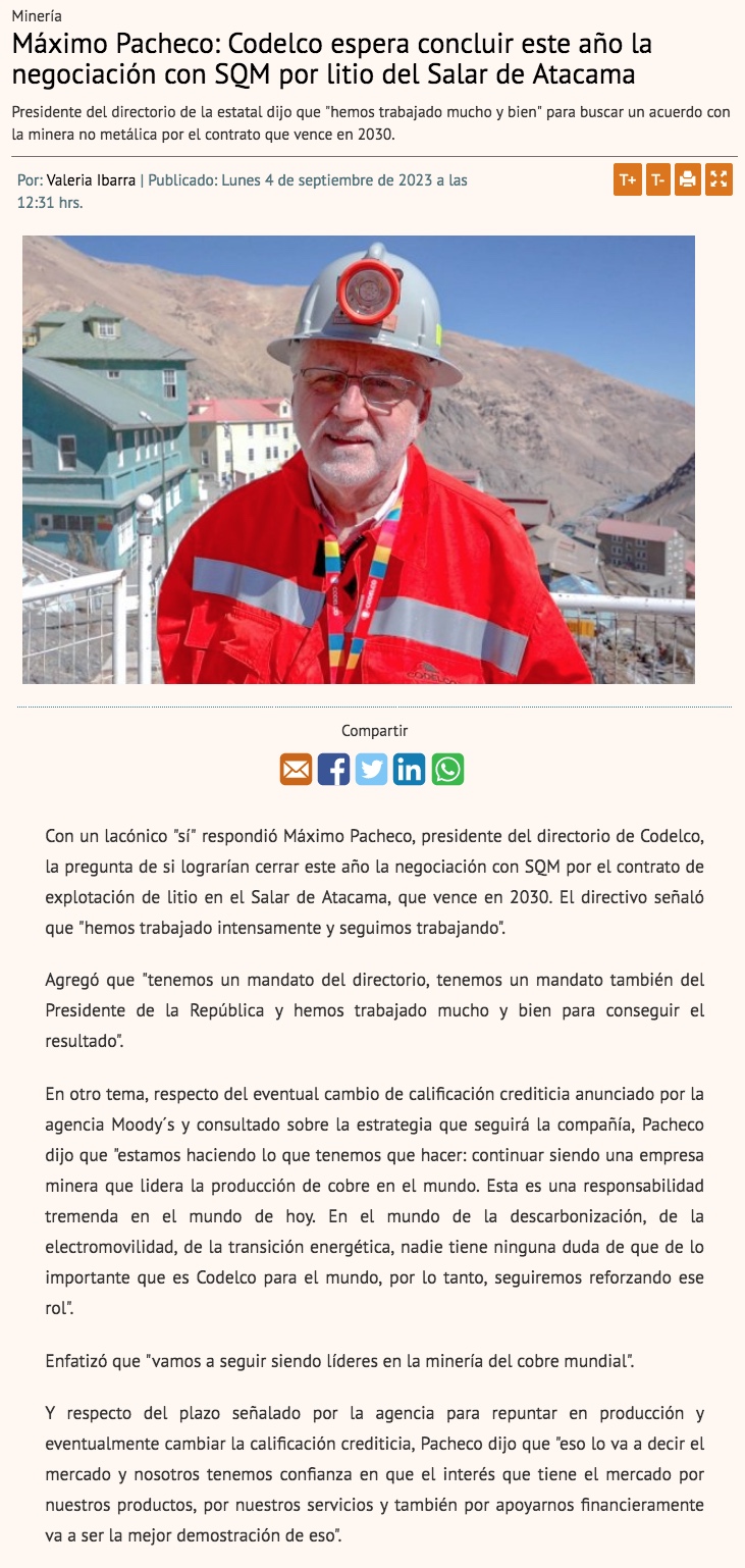 Presidente de Codelco ratifica expectativa de cerrar acuerdo con SQM por producción de litio este año - (Pulso Online)