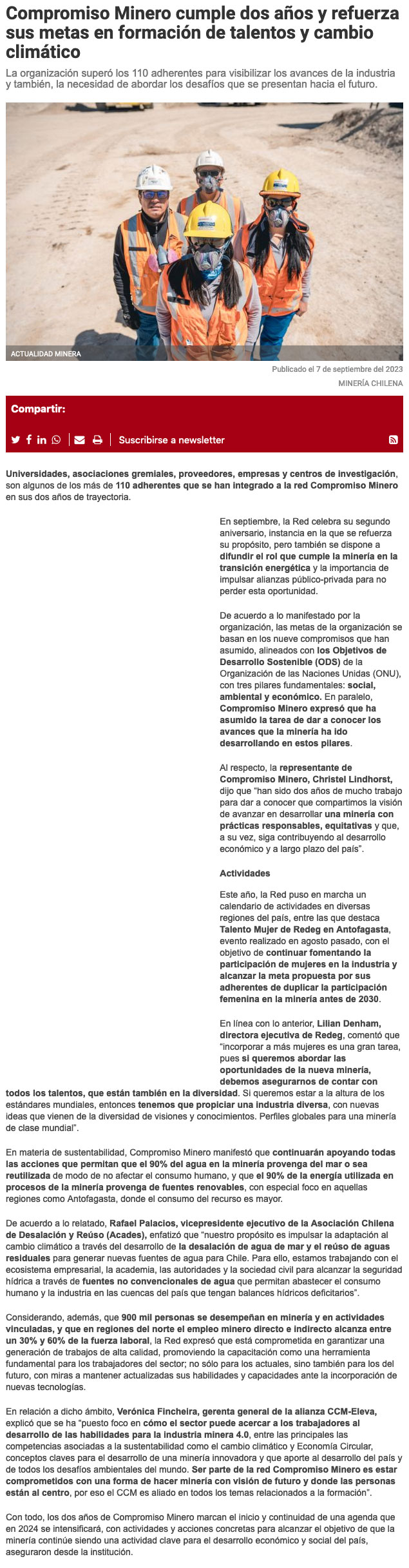 Compromiso Minero refuerza sus metas en la formación de talentos y cambio climático - (El Mercurio de Antofagasta)