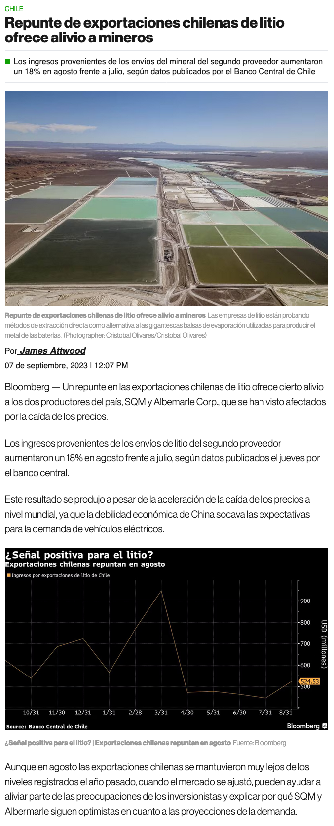 Exportaciones de litio anotan repunte y crecen 18% en agosto - (El Mercurio de Santiago)