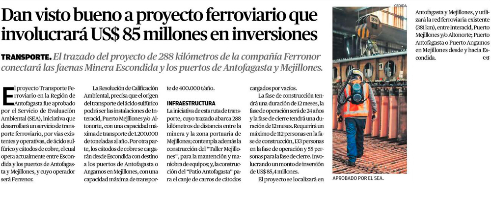 Dan visto bueno a proyecto ferroviario que involucrará US$ 85 millones en inversiones - (El Mercurio de Calama)