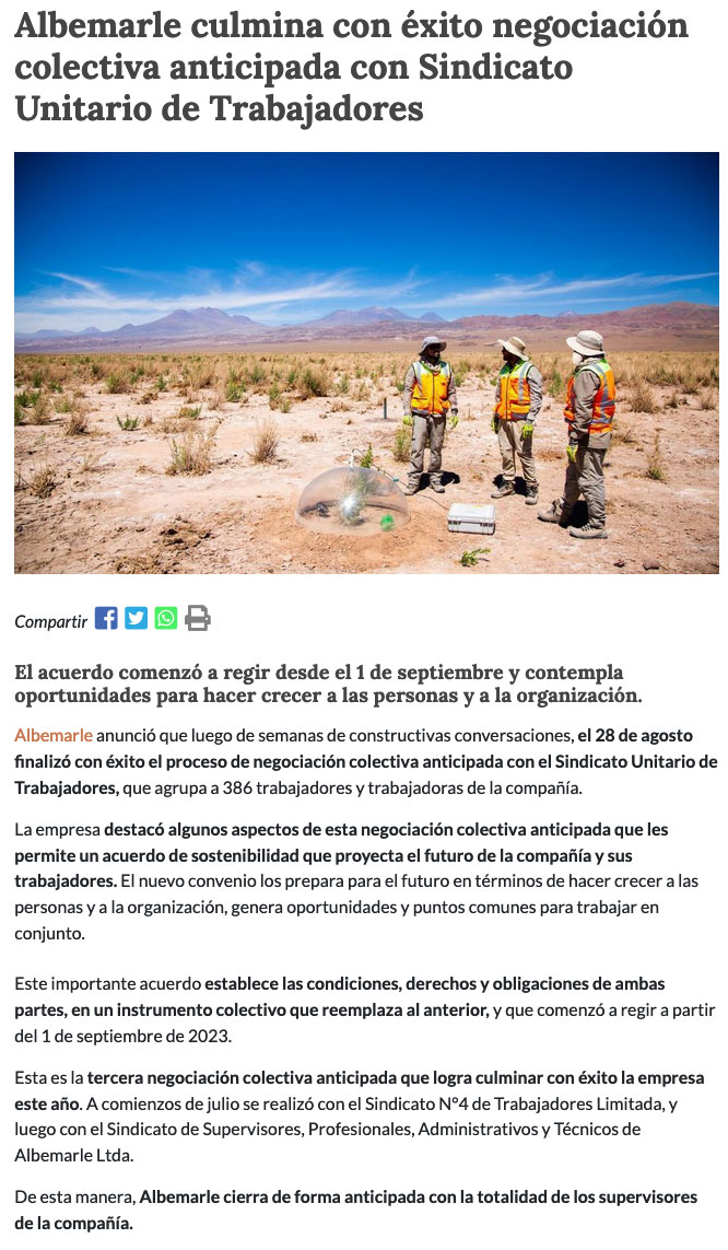 Sindicato de Albemarle firma nuevo convenio colectivo por 36 meses - (El Mercurio de Calama)