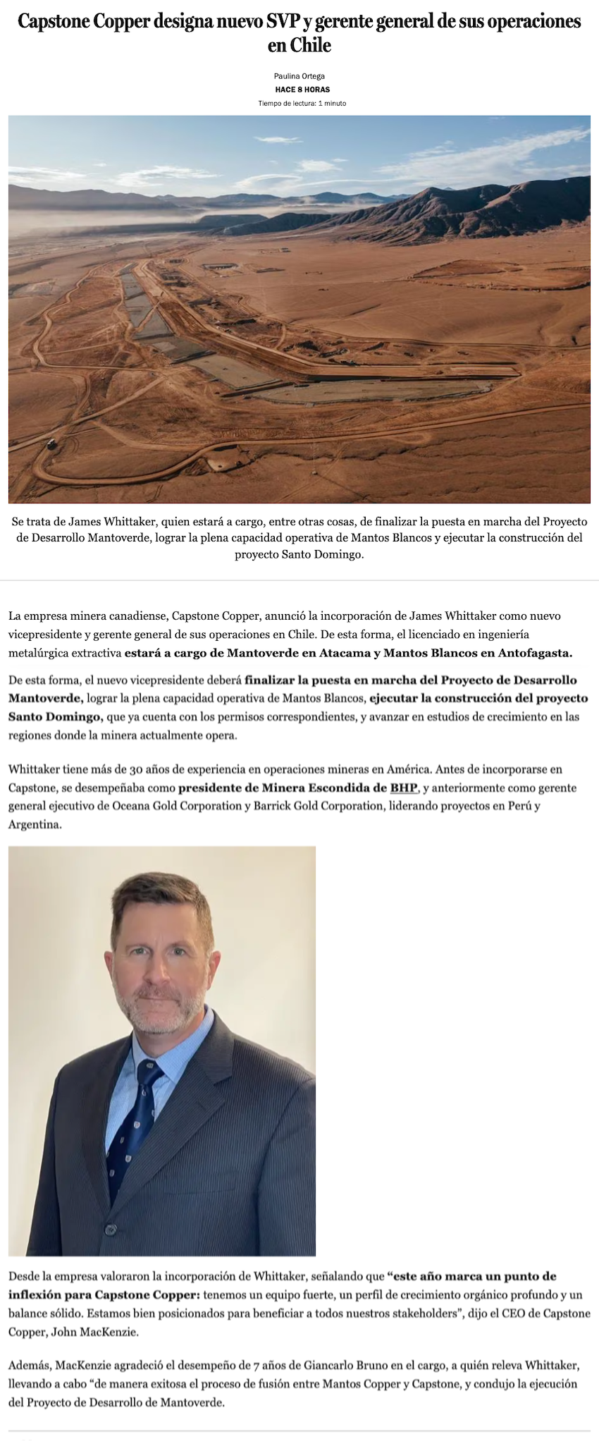 James Whittaker asume como gerente general de operadora de Mantos Blancos - (El Mercurio de Antofagasta)