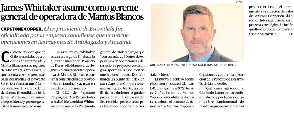 James Whittaker asume como gerente general de operadora de Mantos Blancos - (El Mercurio de Calama)