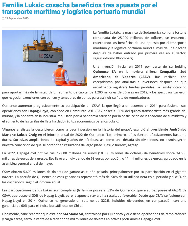 Grupo Luksic duplica su patrimonio gracias a arriesgada inversión portuaria y naviera - (El Mercurio de Antofagasta)