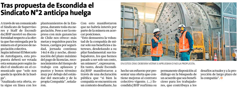 Tras propuesta de Escondida el Sindicato N°2 anticipa huelga - (Estrella del Loa)
