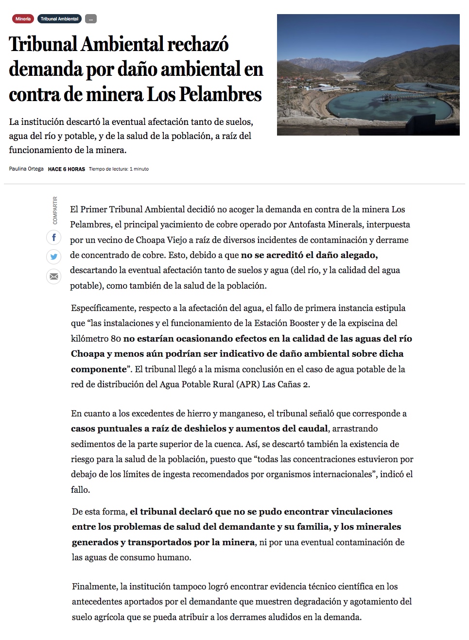 Tribunal rechazó demanda contra mina Pelambres - (Pulso)