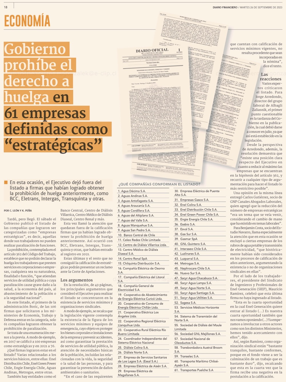 Gobierno define 61 empresas estratégicas y firmas excluidas anuncian reclamación judicial - (El Mercurio de Santiago)