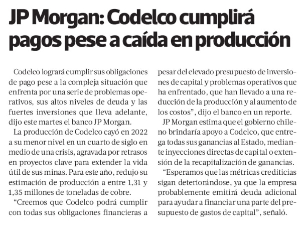 JPMorgan: Codelco “podrá cumplir todas sus obligaciones financieras”, aunque advierte sobre indicadores crediticios - (Diario Financiero)