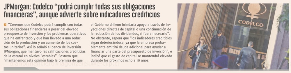 JP Morgan: Codelco cumplirá pagos pese a caída en producción - (Pulso)