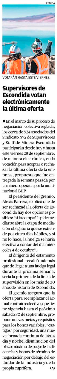 Supervisores de Escondida votan electrónicamente la última oferta - (El Mercurio de Antofagasta)