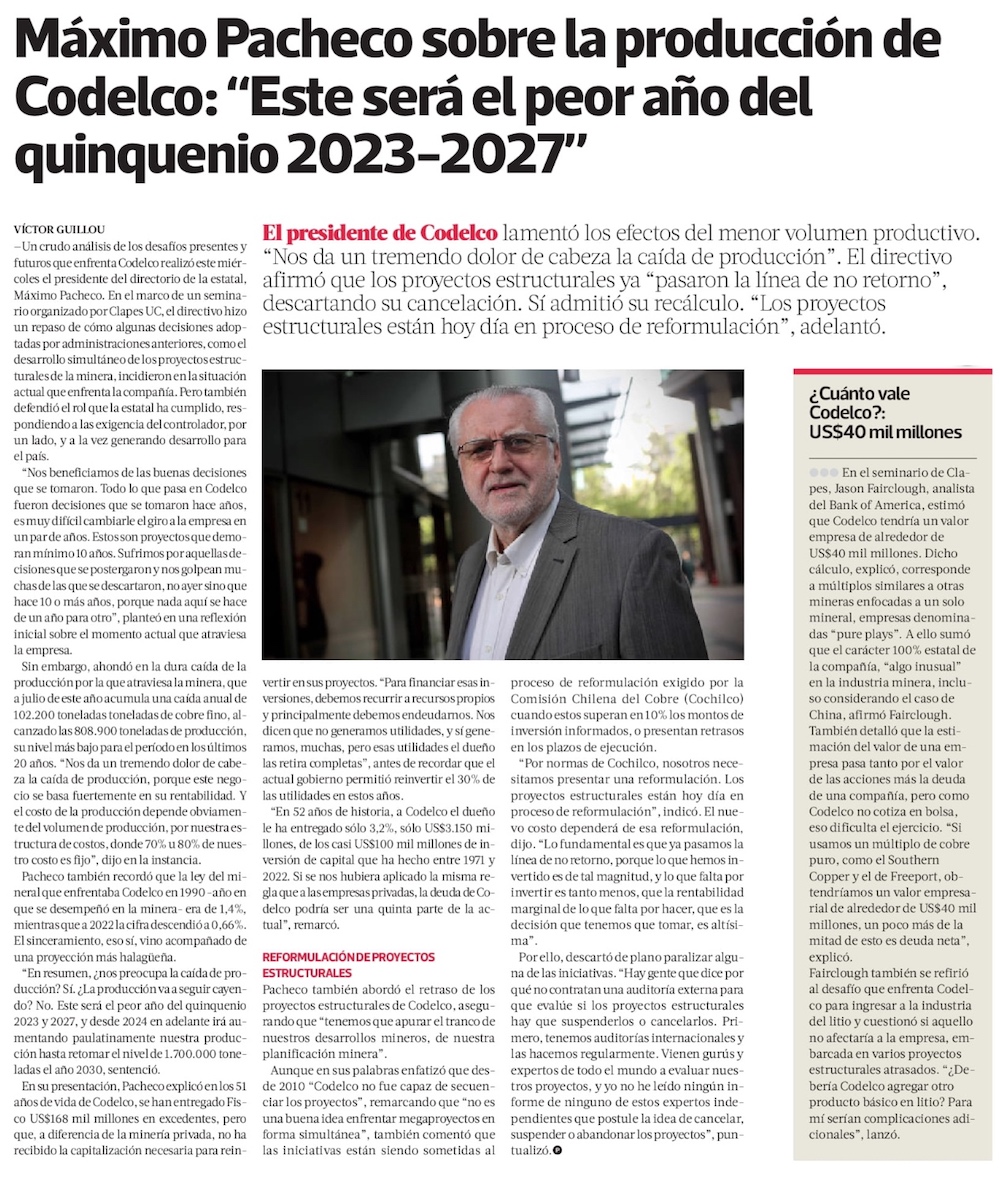 Pacheco dice que desde 1978 han intentado privatizar a Codelco - (El Mercurio de Antofagasta)