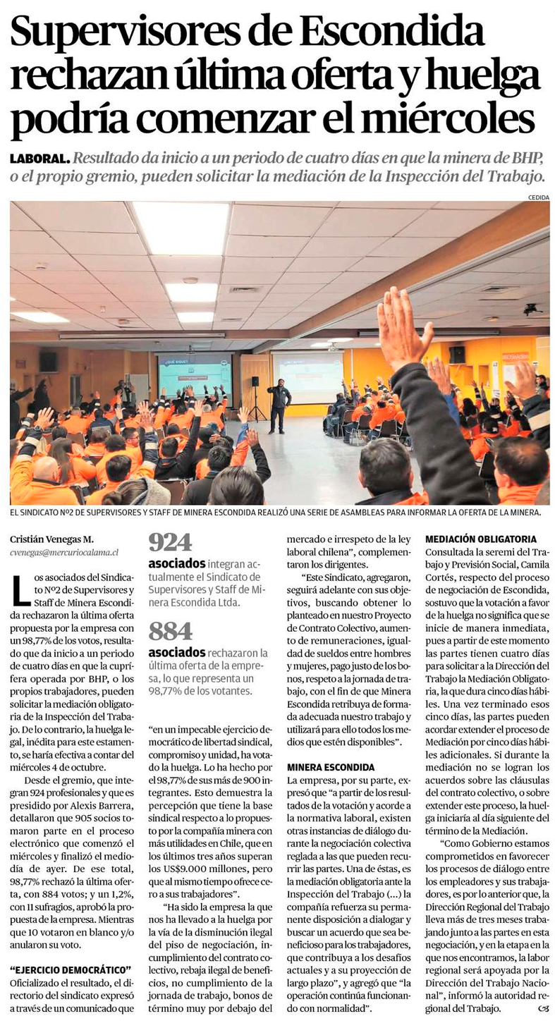 Supervisores de Escondida rechazan última oferta y huelga podría comenzar el miércoles - (El Mercurio de Antofagasta)